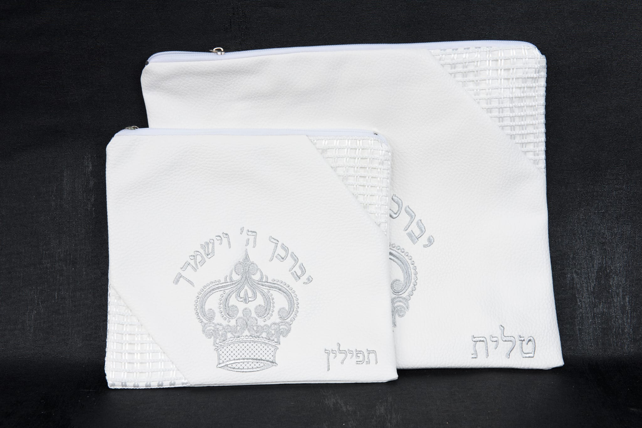 סט לטלית ותפילין דמוי עור אם כתר צבע לבן כסף