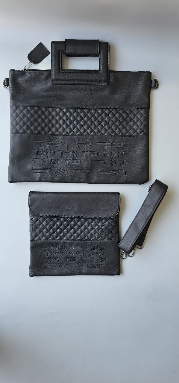 סט תיקים מהודר דמוי עור עם ריקמה "ברכת הכהנים" צבע שחור תיק עם ידית אחיזה וחגורת כתף.